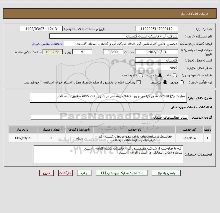 شرح کلی نیاز: عملیات رفع اتفاقات شهر فراغی و روستاهای پیشکمر در شهرستان کلاله-مطابق با اسناد