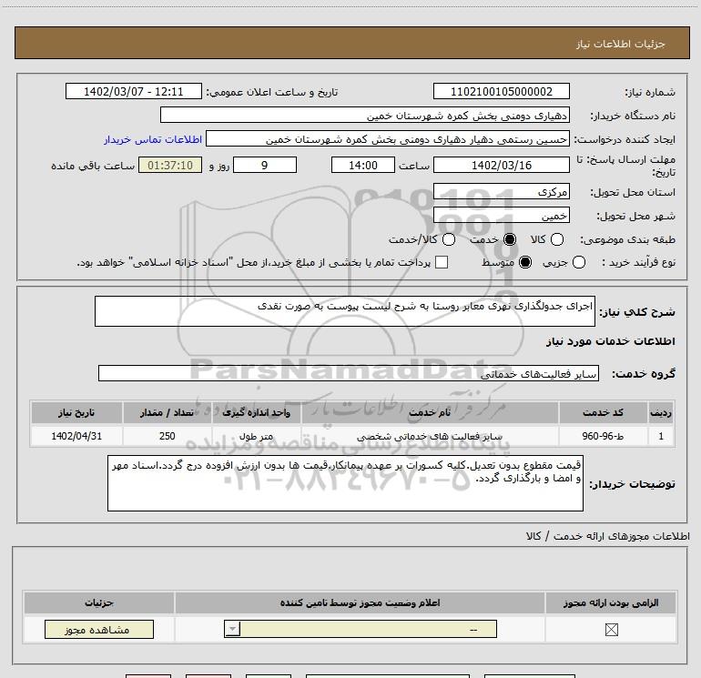 شرح کلی نیاز: اجرای جدولگذاری نهری معابر روستا به شرح لیست پیوست به صورت نقدی