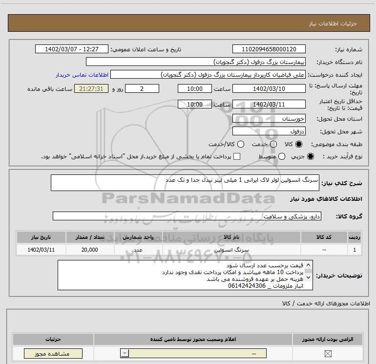 | 1 | -- | سرنگ انسولین | عدد | 20,000 | 1402/03/11 |