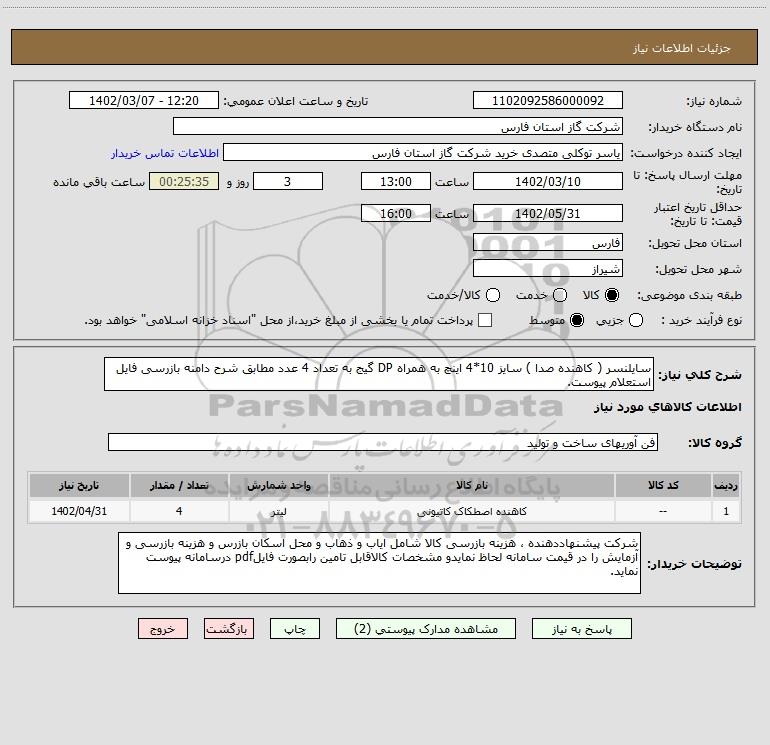 شرح کلی نیاز: سایلنسر ( کاهنده صدا ) سایز 10*4 اینچ به همراه DP گیج به تعداد 4 عدد مطابق شرح دامنه بازرسی فایل استعلام پیوست.
