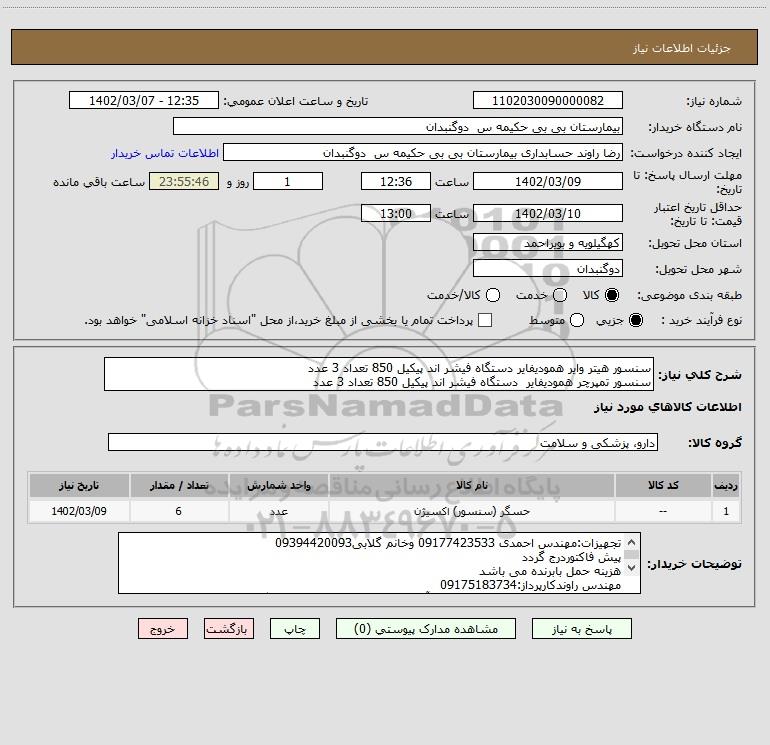 شرح کلی نیاز: سنسور هیتر وایر همودیفایر دستگاه فیشر اند پیکیل 850 تعداد 3 عدد