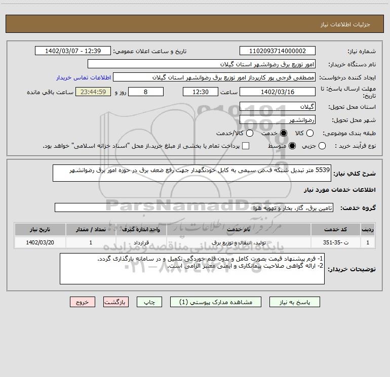 شرح کلی نیاز: 5539 متر تبدیل شبکه ف.ض سیمی به کابل خودنگهدار جهت رفع ضعف برق در حوزه امور برق رضوانشهر