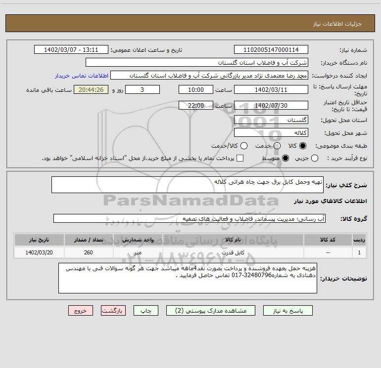 شرح کلی نیاز: تهیه وحمل کابل برق جهت چاه هراتی کلاله
