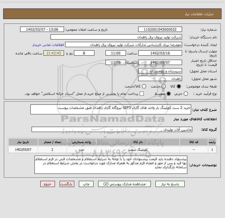 شرح کلی نیاز: خرید 2 ست کوپلینگ بار واحد های گازی GEF5 نیروگاه گازی زاهدان طبق مشخصات پیوست