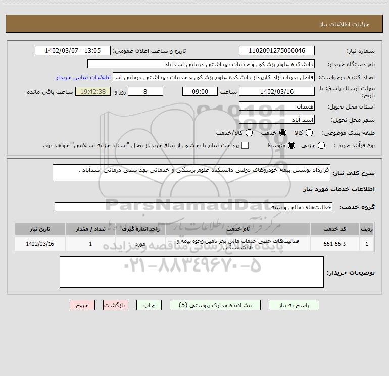 استعلام قرارداد پوشش بیمه خودروهای دولتی دانشکده علوم پزشکی و خدماتی بهداشتی درمانی اسدآباد ., استعلام قرارداد پوشش بیمه خودروهای دولتی دانشکده علوم پزشکی و خدماتی بهداشتی درمانی اسدآباد .