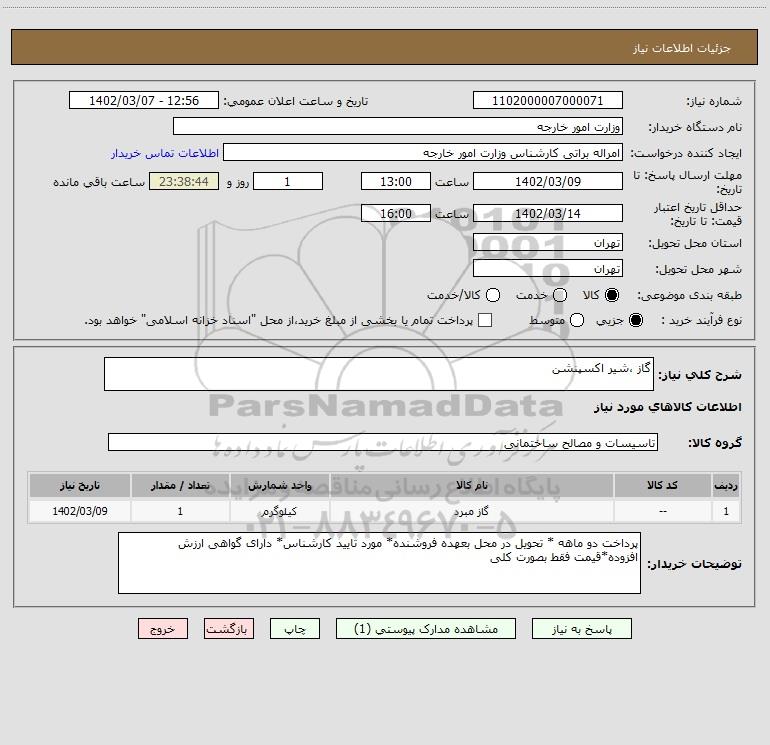 شرح کلی نیاز: گاز ،شیر اکسپنشن