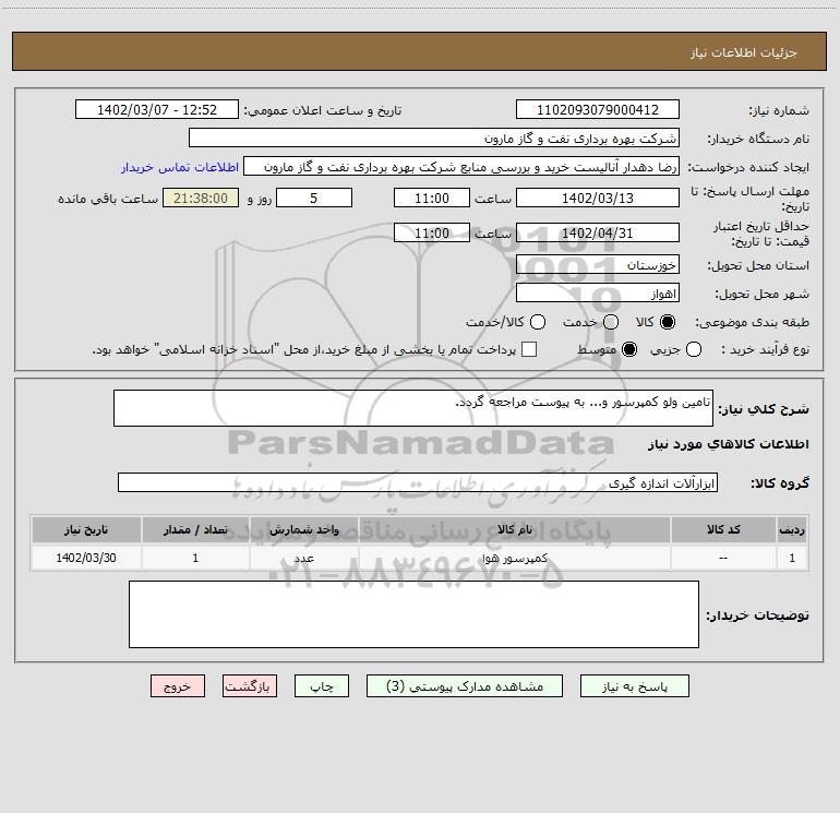 شرح کلی نیاز: تامین ولو کمپرسور و... به پیوست مراجعه گردد.