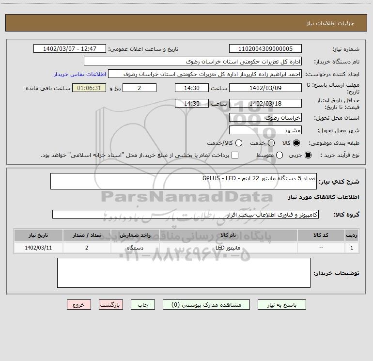 شرح کلی نیاز: تعداد 5 دستگاه مانیتور 22 اینچ - GPLUS - LED