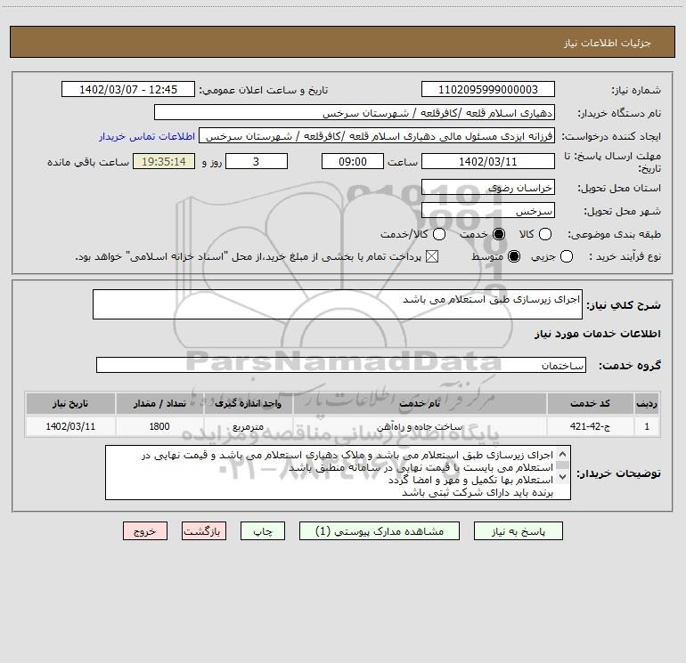 نام دستگاه خریدار:دهیاری اسلام قلعه /کافرقلعه / شهرستان سرخس