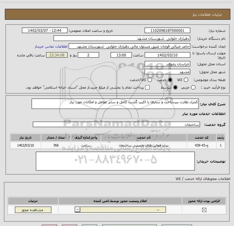 شرح کلی نیاز: کنترل نظارت ببرساخت و سازها با اکیپ گشت کامل و سایر عوامل و امکانات مورد نیاز