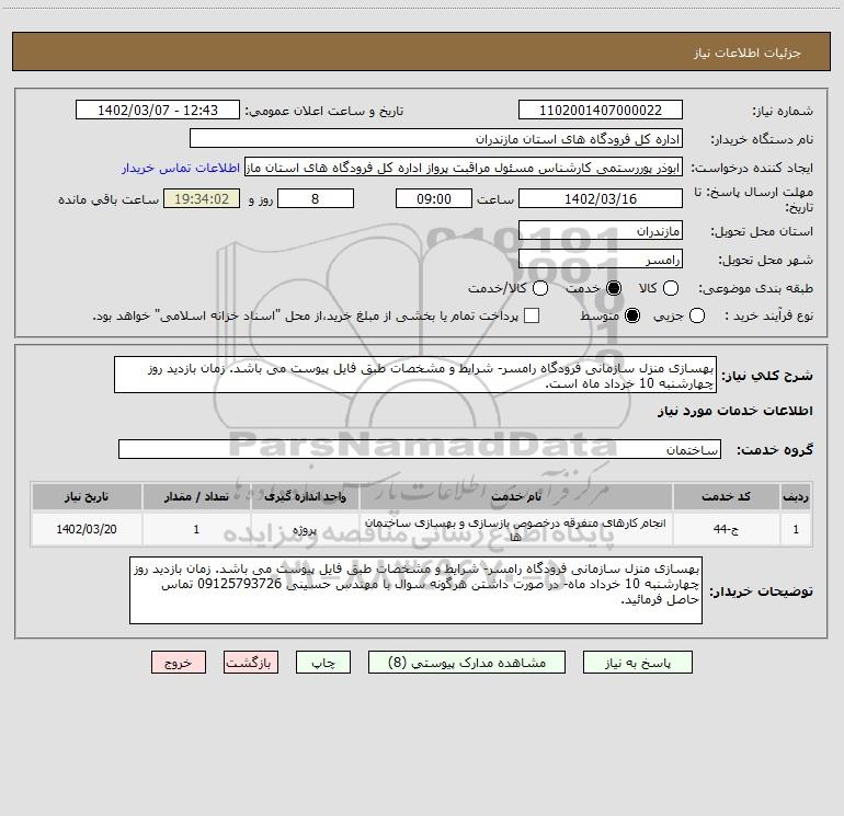 شرح کلی نیاز: بهسازی منزل سازمانی فرودگاه رامسر- شرایط و مشخصات طبق فایل پیوست می باشد. زمان بازدید روز چهارشنبه 10 خرداد ماه است.