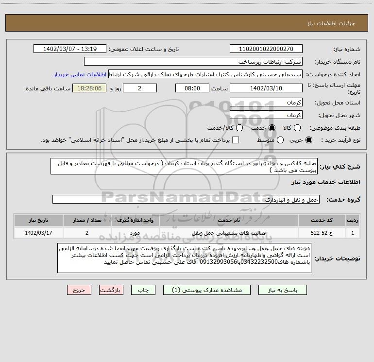شرح کلی نیاز: تخلیه کانکس و دیزل ژنراتور در ایستگاه گندم بریان استان کرمان ( درخواست مطابق با فهرست مقادیر و فایل پیوست می باشد )