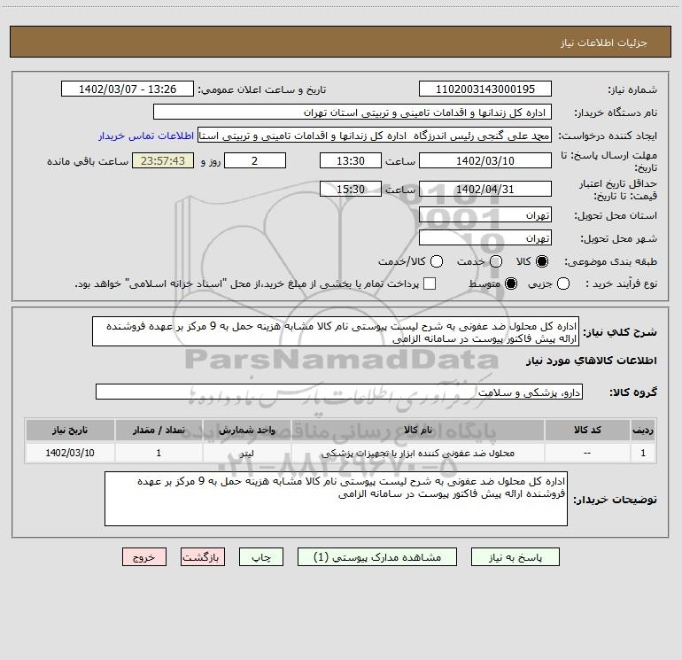 شرح کلی نیاز: اداره کل محلول ضد عفونی به شرح لیست پیوستی نام کالا مشابه هزینه حمل به 9 مرکز بر عهده فروشنده ارائه پیش فاکتور پیوست در سامانه الزامی