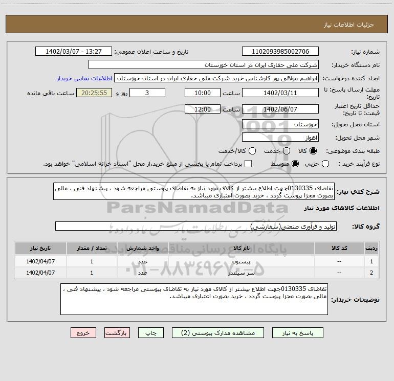 توضیحات خریدار:تقاضای 0130335جهت اطلاع بیشتر از کالای مورد نیاز به تقاضای پیوستی مراجعه شود ، پیشنهاد فنی ، مالی بصورت مجزا پیوست گردد ، خرید بصورت اعتباری میباشد.