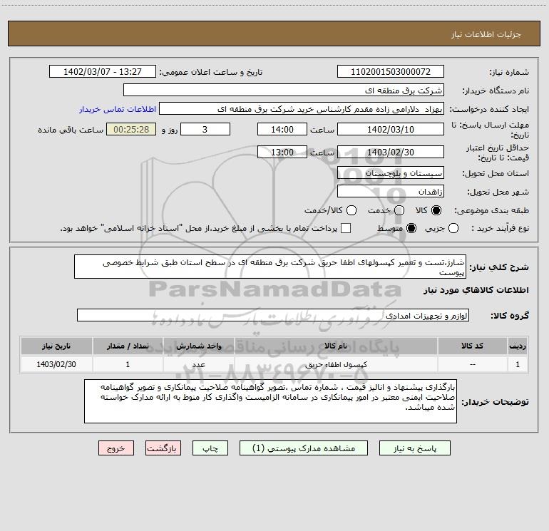 استعلام شارژ،تست و تعمیر کپسولهای اطفا حریق شرکت برق منطقه ای در سطح استان طبق شرایط خصوصی پیوست, استعلام شارژ،تست و تعمیر کپسولهای اطفا حریق شرکت برق منطقه ای در سطح استان طبق شرایط خصوصی پیوست