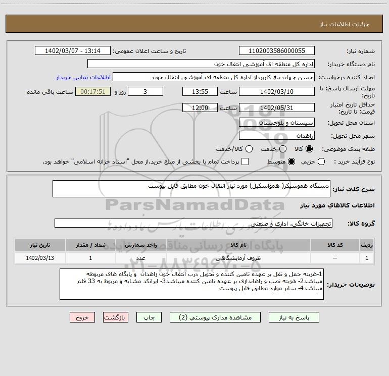 شرح کلی نیاز: دستگاه هموشیکر( همواسکیل) مورد نیاز انتقال خون مطابق فایل پیوست