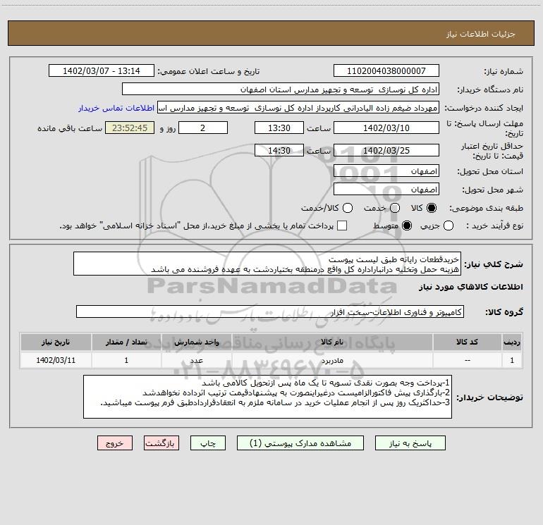 شرح کلی نیاز: خریدقطعات رایانه طبق لیست پیوست هزینه حمل وتخلیه درانباراداره کل واقع درمنطقه بختیاردشت به عهده فروشنده می باشد