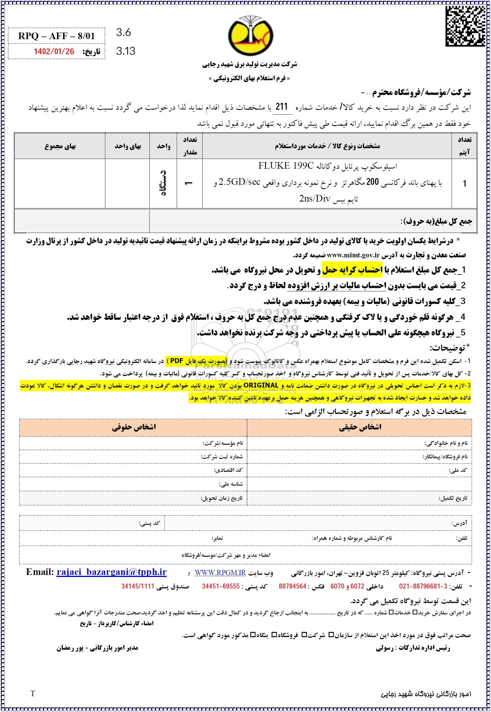1- اسکن تکمیل شده این فرم و مشخصات کامل موضوع استعلام به همراه عکس و کاتالوگ پیوست شود و بصورت یک فایل pdf در سامانه الکترونیکی نیروگاه شهید رجایی بارگذاری گردد