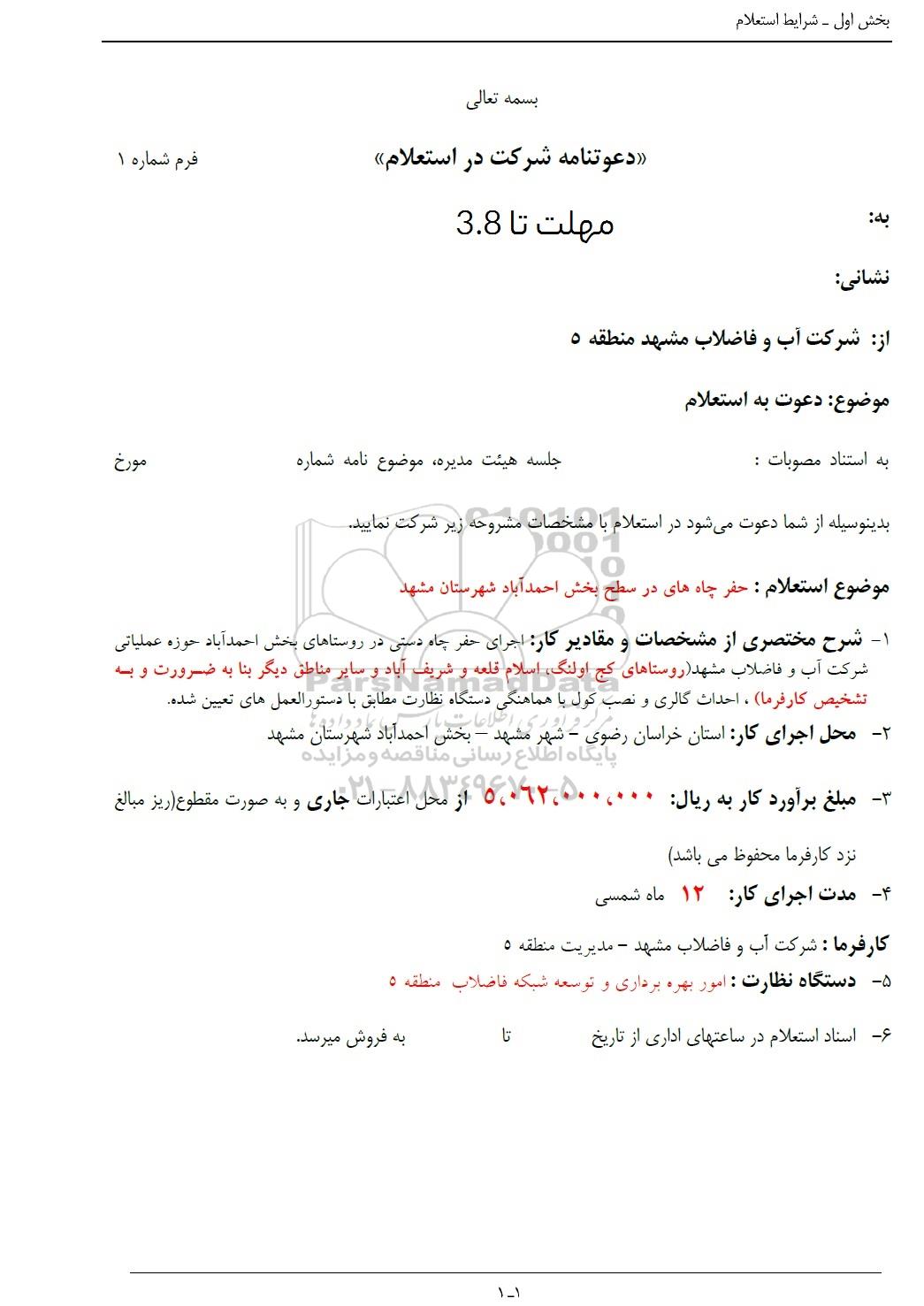 موضوع استعلام: حفر چاه های در سطح بخش احمدآباد شهرستان مشهد