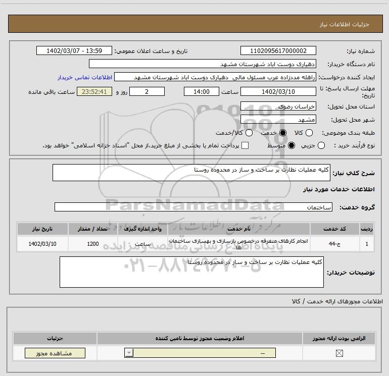 شرح کلی نیاز: کلیه عملیات نظارت بر ساخت و ساز در محدوده روستا