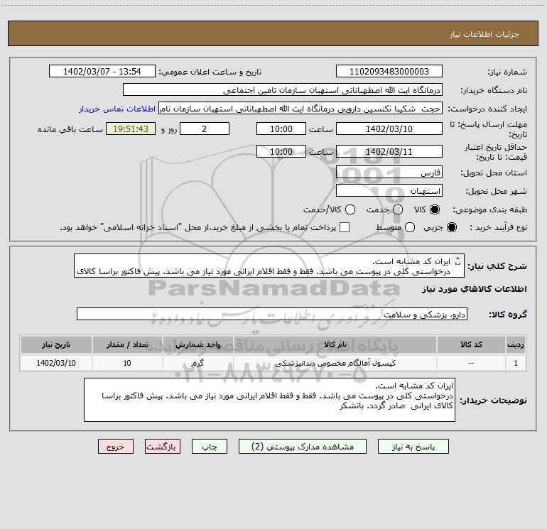 استعلام بها و موضوع استعلام استعلام ایران کد مشابه است. درخواستی کلی در پیوست می باشد. فقط و فقط اقلام ایرانی مورد نیاز می باشد. پیش فاکتور براسا کالای ایرانی صادر گردد. باتشکر به اطلاع کلیه شرکتها و افراد متخصص واجد شرایط میرساند، آگهی گذار در نظر دارد از طریق استعلام بها، نسبت به انتخاب و دریافت پیشنهادات اقدام نماید. این استعلام با کد آگهی ثبت شده در سامانه خبرگزاری پارس نماد : 5883119 منتشر شده است. مشخصات استعلام : تاریخ شروع استعلام: 1402/03/07 آخرین مهلت ارسال پیشنهاد قیمت : 1402/03/10 و محل اجرای پروژه : استان فارس میباشد. استعلام قیمت مورد درخواست : استعلام ایران کد مشابه است. درخواستی کلی در پیوست می باشد. فقط و فقط اقلام ایرانی مورد نیاز می باشد. پیش فاکتور براسا کالای ایرانی صادر گردد. باتشکر با دستهبندیهای تخصصی و گروه های مرتبط : خدمات و تجهیزات آزمایشگاهی و پزشکی, استعلام اطلاع رسانی میگردد.