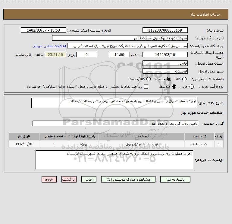 شرح کلی نیاز: اجرای عملیات برق رسانی و انتقال نیرو به شهرک صنعتی بیرم در شهرستان لارستان