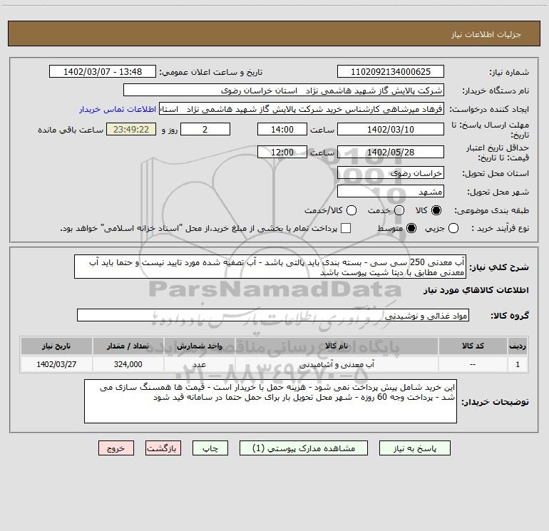 نام دستگاه خریدار:شرکت پالایش گاز شهید هاشمی نژاد استان خراسان رضوی