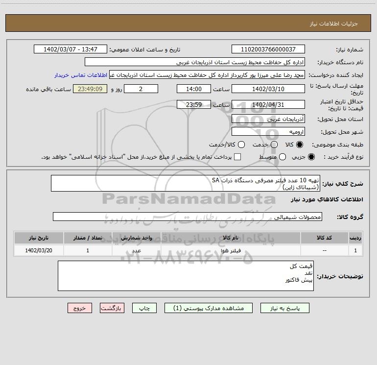 شرح کلی نیاز: تهیه 10 عدد فیلتر مصرفی دستگاه ذرات SA