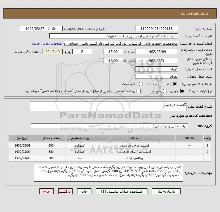 | 1 | -- | گوشت مرغ با افزودنی | کیلوگرم | 600 | 1402/03/09 |
