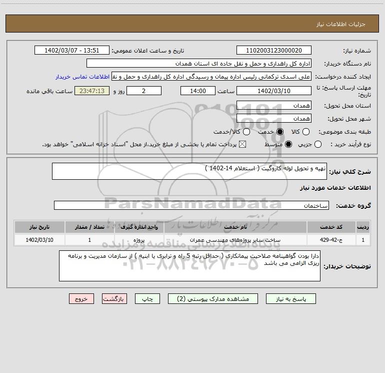 شرح کلی نیاز: تهیه و تحویل لوله کاروگیت ( استعلام 14-1402 )