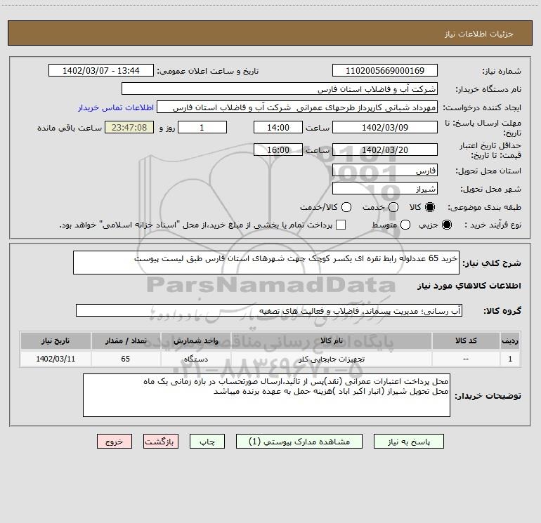 شرح کلی نیاز: خرید 65 عددلوله رابط نقره ای یکسر کوچک جهت شهرهای استان فارس طبق لیست پیوست