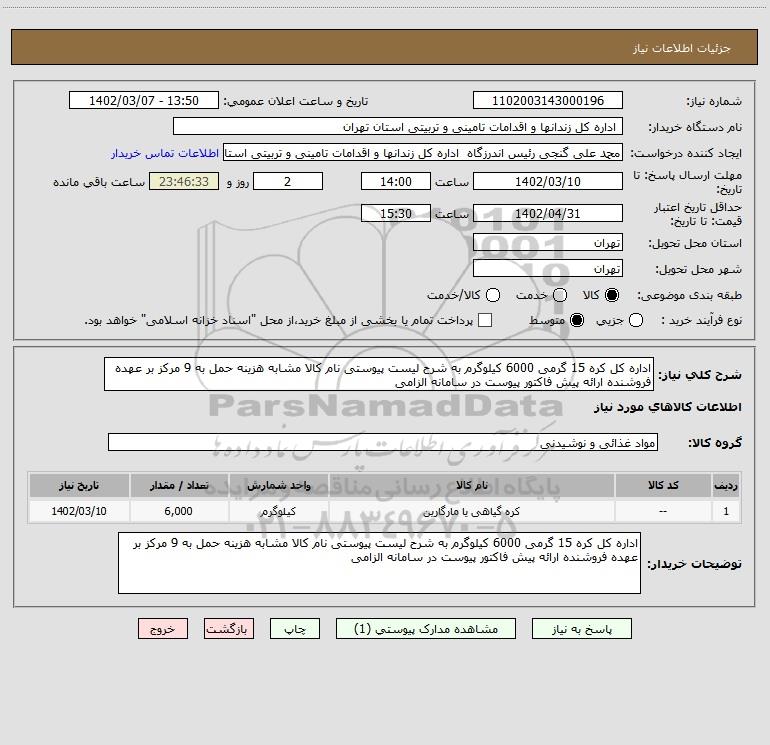 استعلام اداره کل کره 15 گرمی 6000 کیلوگرم به شرح لیست پیوستی نام کالا مشابه هزینه حمل به 9 مرکز بر عهده فروشنده ارائه پیش فاکتور پیوست در سامانه الزامی, استعلام اداره کل کره 15 گرمی 6000 کیلوگرم به شرح لیست پیوستی نام کالا مشابه هزینه حمل به 9 مرکز بر عهده فروشنده ارائه پیش فاکتور پیوست در سامانه الزامی