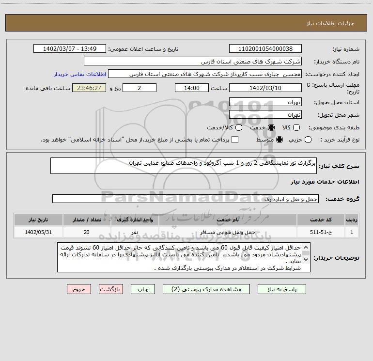 شرح کلی نیاز: برگزاری تور نمایشگاهی 2 روز و 1 شب آگروفود و واحدهای صنایع غذایی تهران