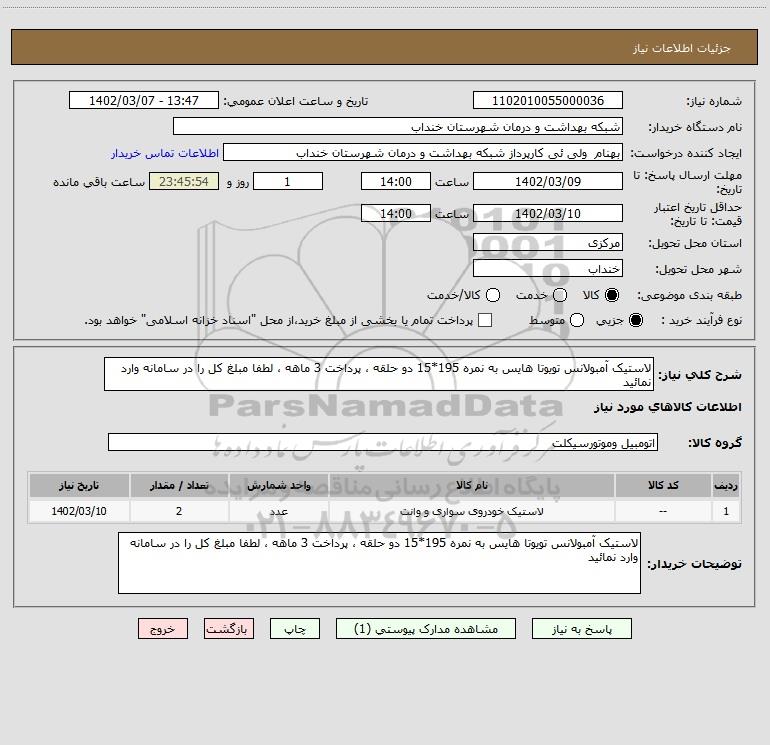 شرح کلی نیاز: لاستیک آمبولانس تویوتا هایس به نمره 195*15 دو حلقه ، پرداخت 3 ماهه ، لطفا مبلغ کل را در سامانه وارد نمائید