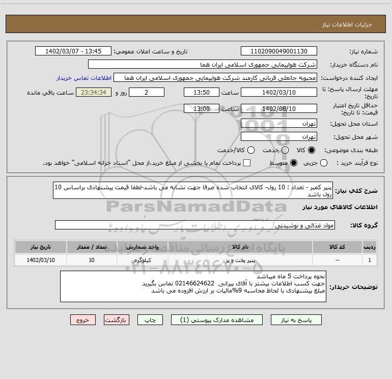 شرح کلی نیاز: پنیر کمبر - تعداد : 10 رول- کالای انتخاب شده صرفا جهت تشابه می باشد-لطفا قیمت پیشنهادی براساس 10 رول باشد