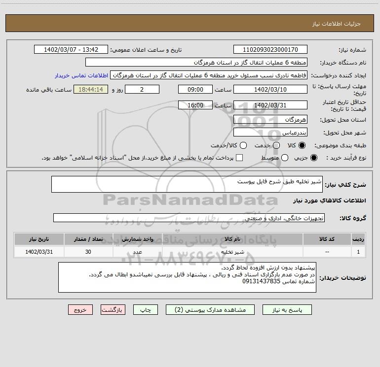 | 1 | -- | شیر تخلیه | عدد | 30 | 1402/03/31 |