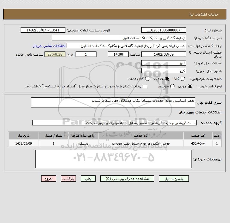 شرح کلی نیاز: تعمیر اساسی موتور خودروی نیسان پیکاپ مدل80 روغن سوزی شدید