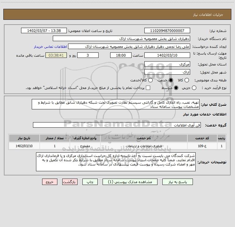 شرح کلی نیاز: تهیه، نصب، راه اندازی کامل و گارانتی سیستم نظارت تصویری تحت شبکه دهیاری شانق مطابق با شرایط و مشخصات پیوست سامانه ستاد