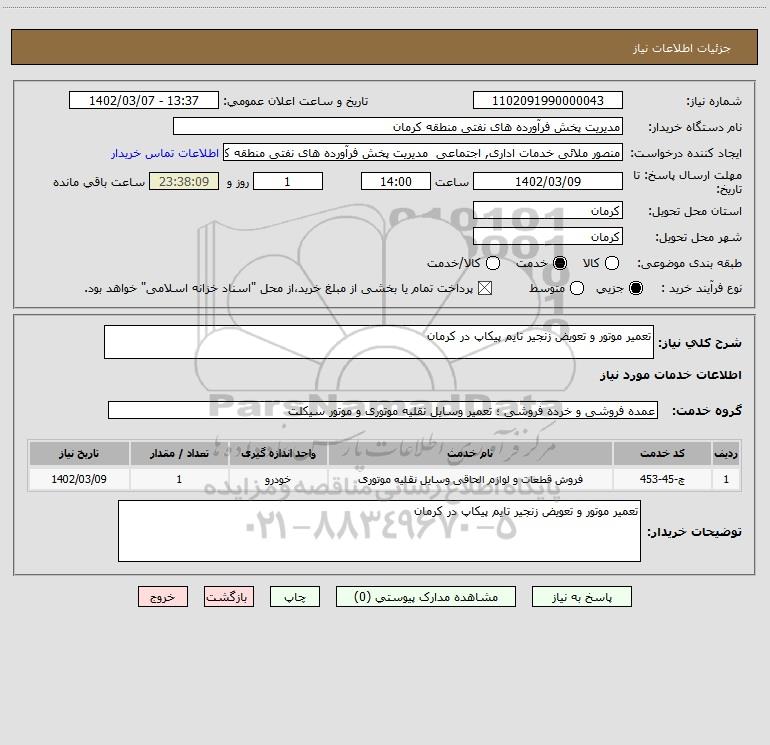 شرح کلی نیاز: تعمیر موتور و تعویض زنجیر تایم پیکاپ در کرمان