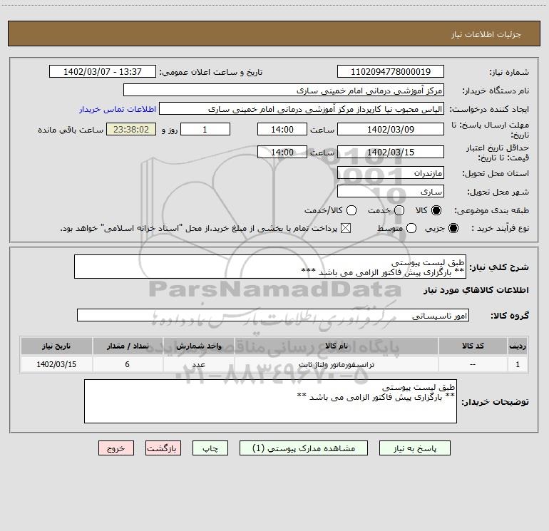 استعلام بها و موضوع استعلام استعلام طبق لیست پیوستی ** بارگزاری پیش فاکتور الزامی می باشد *** به اطلاع کلیه شرکتها و افراد متخصص واجد شرایط میرساند، آگهی گذار در نظر دارد از طریق استعلام بها، نسبت به انتخاب و دریافت پیشنهادات اقدام نماید. این استعلام با کد آگهی ثبت شده در سامانه خبرگزاری پارس نماد : 5883294 منتشر شده است. مشخصات استعلام : تاریخ شروع استعلام: 1402/03/07 آخرین مهلت ارسال پیشنهاد قیمت : 1402/03/09 و محل اجرای پروژه : استان مازندران میباشد. استعلام قیمت مورد درخواست : استعلام طبق لیست پیوستی ** بارگزاری پیش فاکتور الزامی می باشد *** با دستهبندیهای تخصصی و گروه های مرتبط : ترانسفورماتور, تجهیزات برق و الکترونیک, استعلام اطلاع رسانی میگردد.