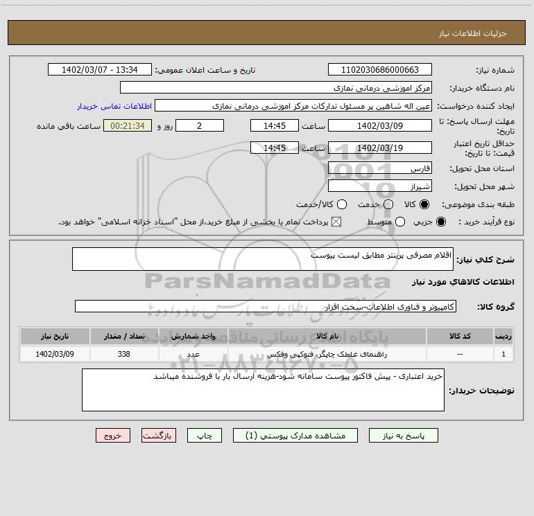شرح کلی نیاز: اقلام مصرفی پرینتر مطابق لیست پیوست