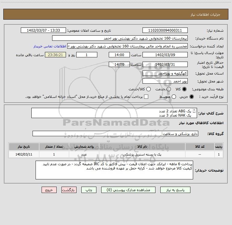 شرح کلی نیاز: پک ABG تعداد 2 عدد پک NAK تعداد 3 عدد کنترل NAK تعداد 4 عدد