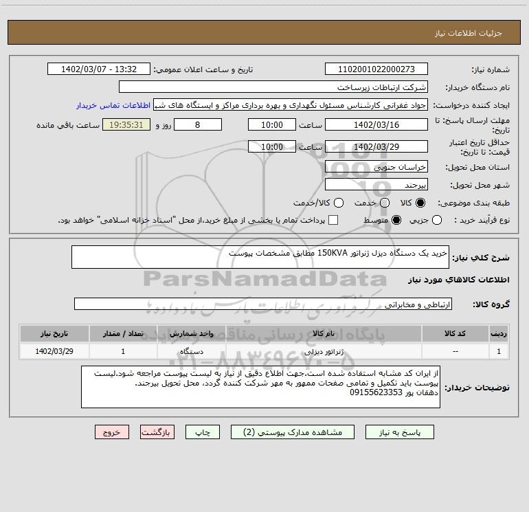 شرح کلی نیاز: خرید یک دستگاه دیزل ژنراتور 150KVA مطابق مشخصات پیوست