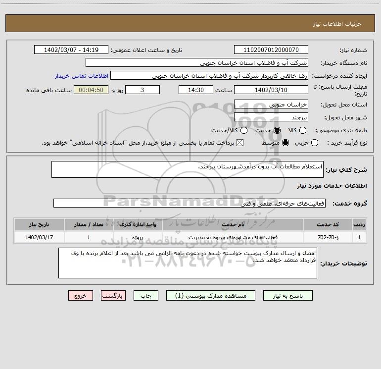 شرح کلی نیاز: استعلام مطالعات آب بدون درآمدشهرستان بیرجند.