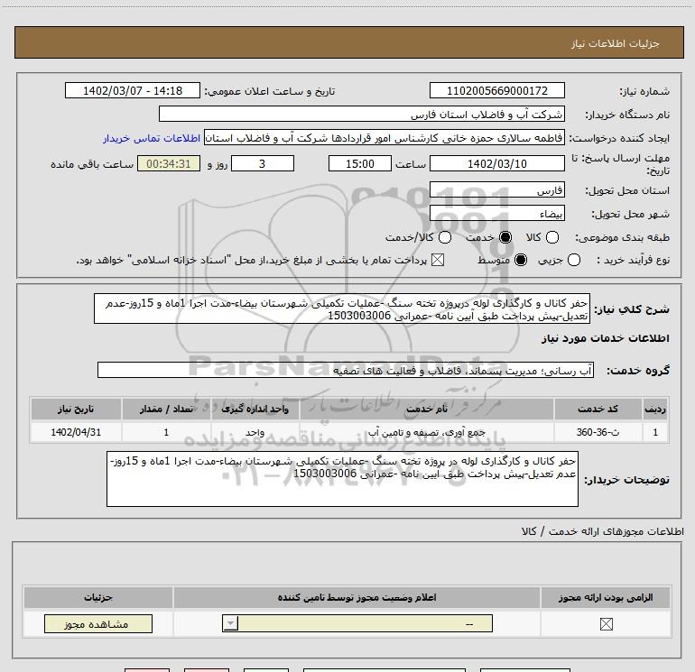 شرح کلی نیاز: حفر کانال و کارگذاری لوله درپروژه تخته سنگ -عملیات تکمیلی شهرستان بیضاء-مدت اجرا 1ماه و 15روز-عدم تعدیل-پیش پرداخت طبق آیین نامه -عمرانی 1503003006