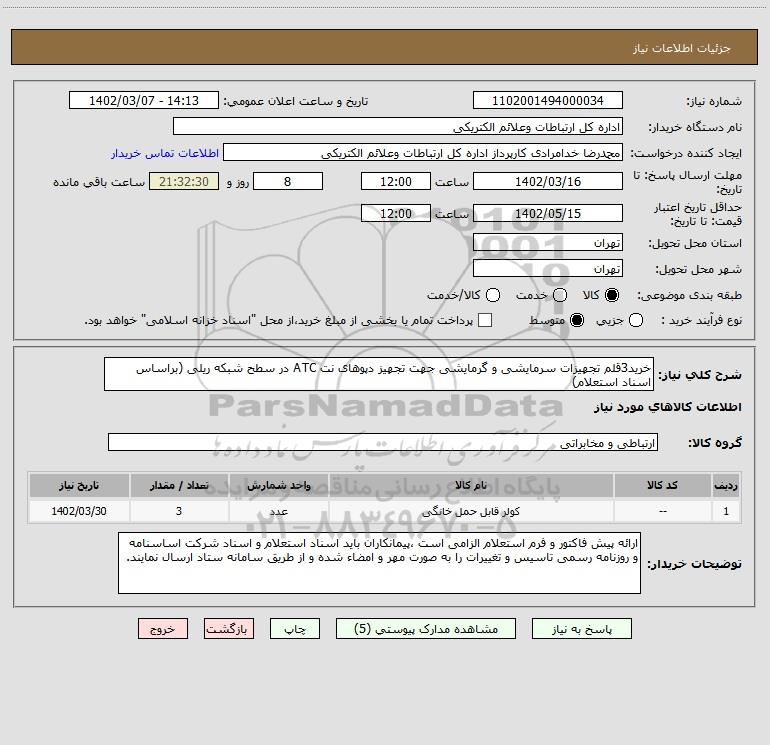 شرح کلی نیاز: خرید3قلم تجهیزات سرمایشی و گرمایشی جهت تجهیز دپوهای نت ATC در سطح شبکه ریلی (براساس اسناد استعلام)