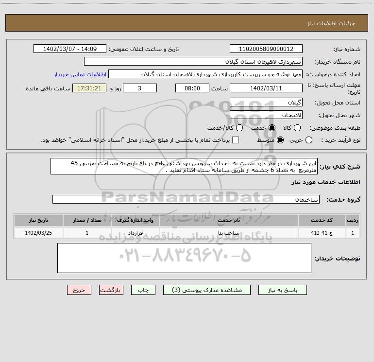 شرح کلی نیاز: این شهرداری در نظر دارد نسبت به احداث سرویس بهداشتی واقع در باغ نارنج به مساحت تقریبی 45 مترمربع به تعداد 6 چشمه از طریق سامانه ستاد اقدام نماید .