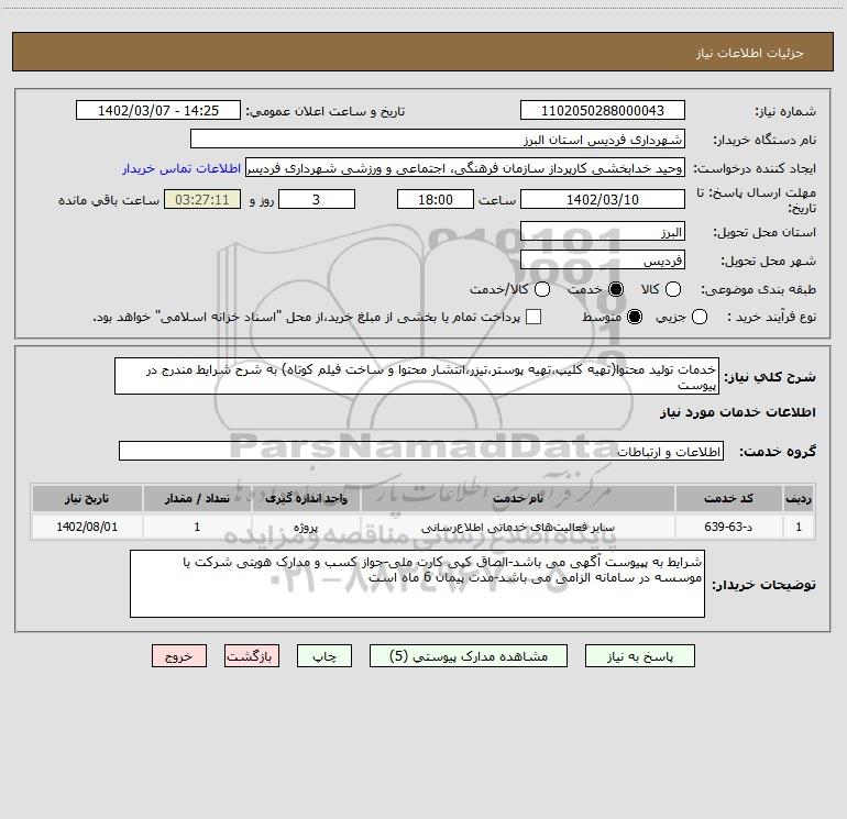 شرح کلی نیاز: خدمات تولید محتوا(تهیه کلیپ،تهیه پوستر،تیزر،انتشار محتوا و ساخت فیلم کوتاه) به شرح شرایط مندرج در پیوست