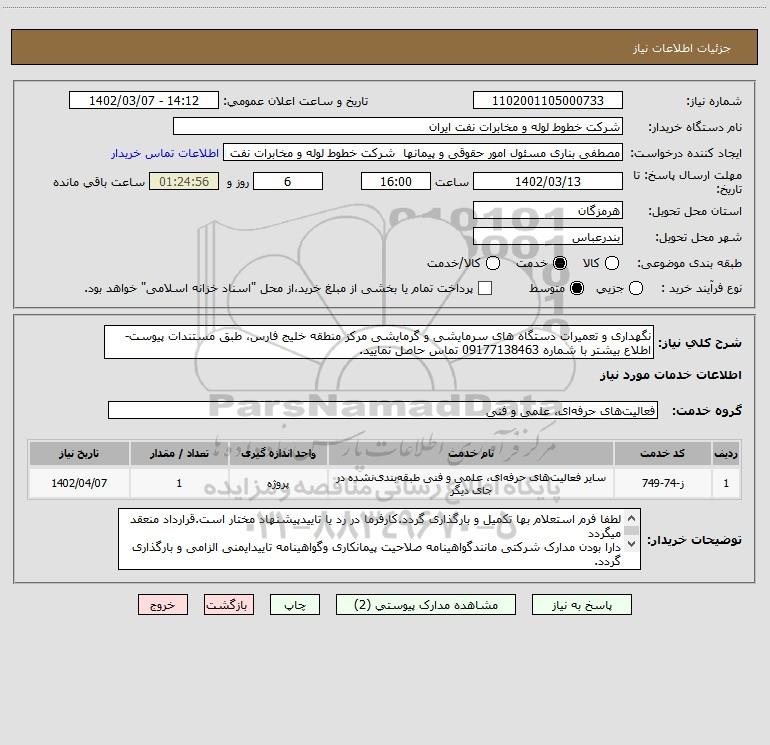 شرح کلی نیاز: نگهداری و تعمیرات دستگاه های سرمایشی و گرمایشی مرکز منطقه خلیج فارس، طبق مستندات پیوست-اطلاع بیشتر با شماره 09177138463 تماس حاصل نمایید.