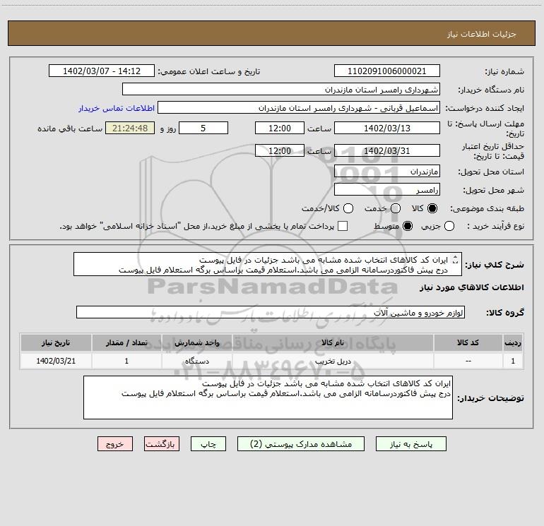 شرح کلی نیاز: ایران کد کالاهای انتخاب شده مشابه می باشد جزئیات در فایل پیوست درج پیش فاکتوردرسامانه الزامی می باشد.استعلام قیمت براساس برگه استعلام فایل پیوست